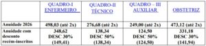 Enfermeiro (a): R$ R$ 752,69 ; Obstetriz: R$ 735,25.