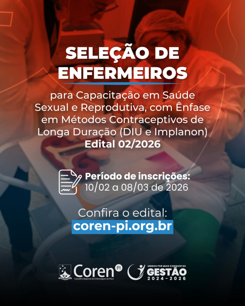 O Conselho Regional de Enfermagem do Piauí (Coren-PI) lançou o Edital nº 02/2026, que trata do Processo Seletivo para Capacitação de Enfermeiras e Enfermeiros em Saúde Sexual e Reprodutiva, com ênfase nos Métodos Contraceptivos de Longa Duração (LARC), especificamente o Dispositivo Intrauterino (DIU) e o Implante Subdérmico Contraceptivo (Implanon).